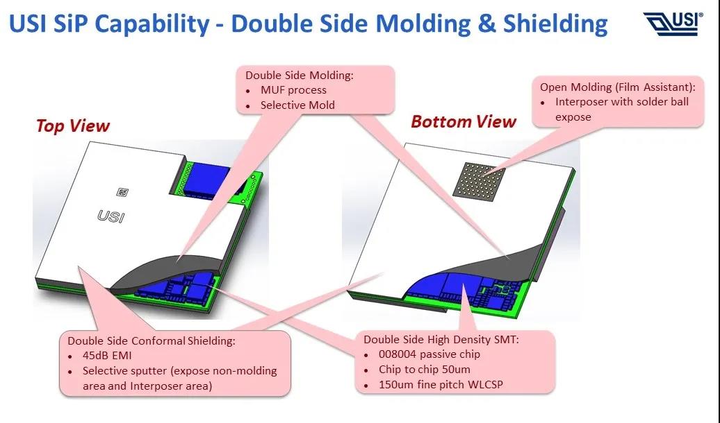 環旭電(diàn)子系統級封裝SiP模塊微小(xiǎo)化制(zhì)程技(jì)術(shù)能力主要有(yǒu)單面塑封(Single Side Molding, SSM)和(hé)雙面塑封(Double Side Molding, DSM)。其中單面塑封主要核心技(jì)術(shù)是高(gāo)密度SiP以智能手表為(wèi)例可(kě)運用008004被動元件間(jiān)距達50μm在20毫米左右的主闆面積上(shàng)可(kě)置入1000多(duō)顆元件;采用Molding形式不需要Underfill點膠加上(shàng)Laser Marking 的能力更可(kě)最大(dà)化節省空(kōng)間(jiān)與成本。